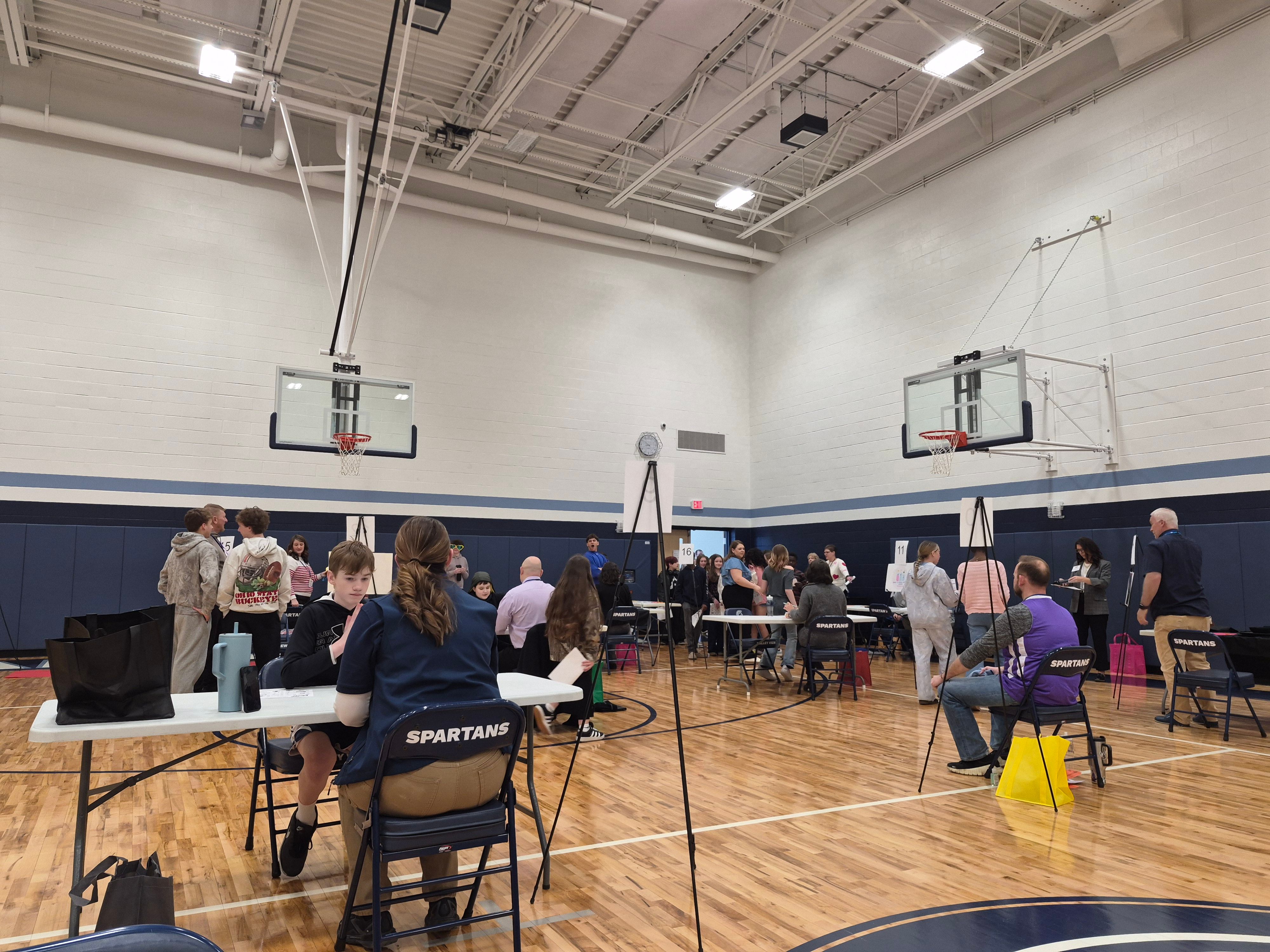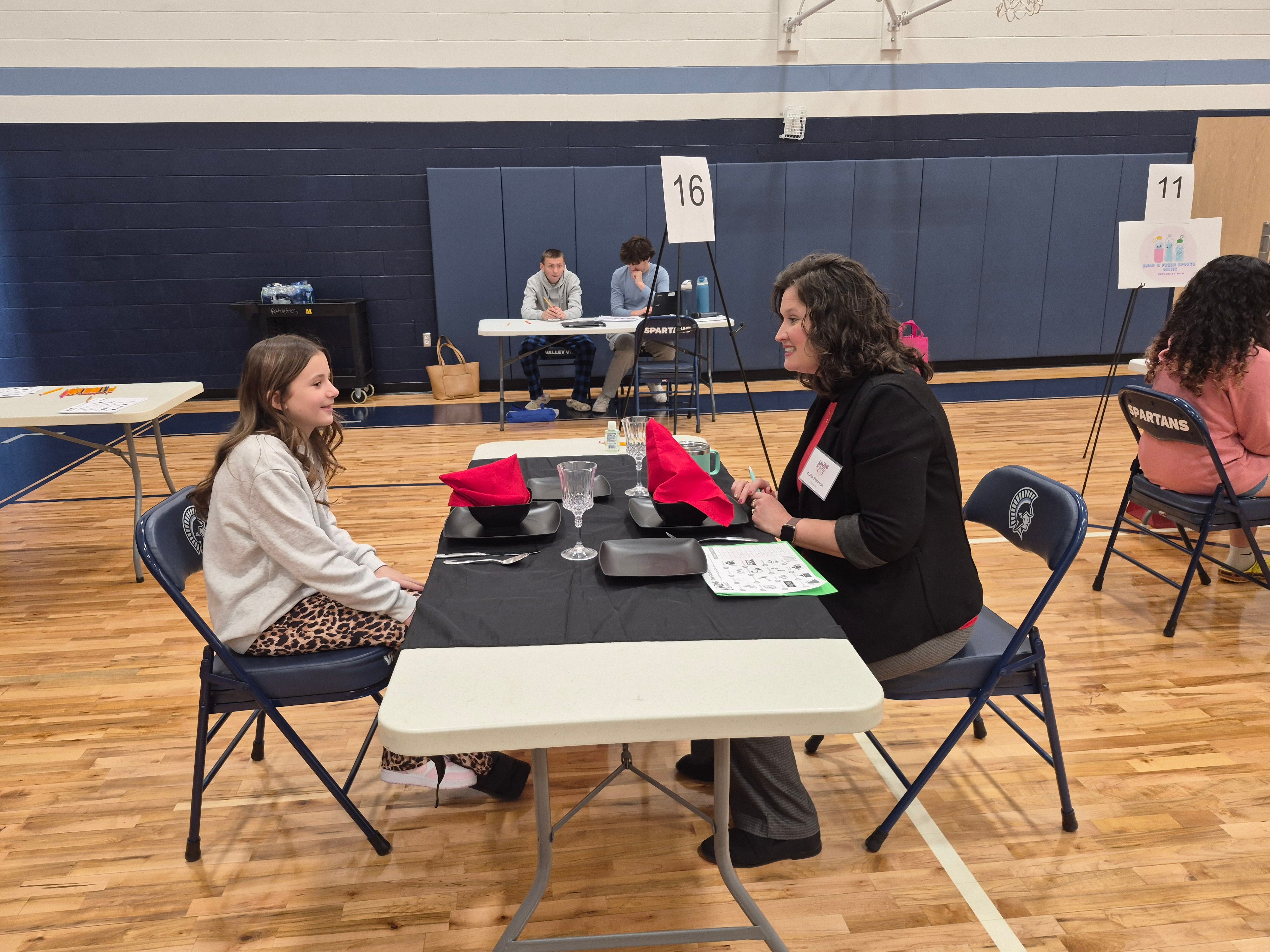 A group of a dozen volunteers staffed 14 stations in the gym, with students spending roughly 90 seconds responding to scenarios like hosting a cooking show, giving an Oscars speech, delivering a pep talk, graciously accepting a bad gift, walking a runway, planning a family trip, and dining etiquette.