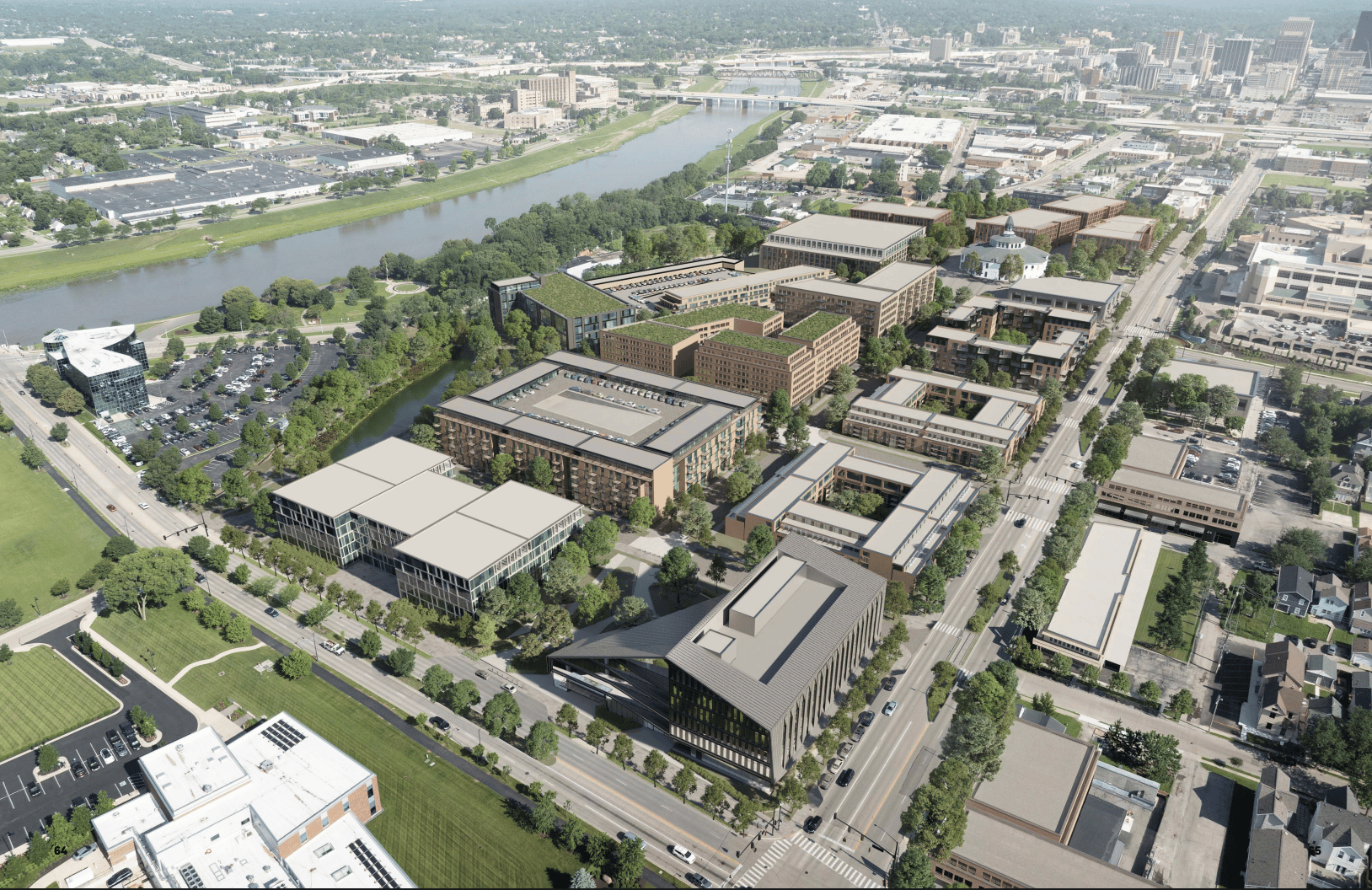 Future vision for the former fairgrounds site, with landmarks like the Great Miami River, Roundhouse and Stewart and Main Streets 📸 onMain