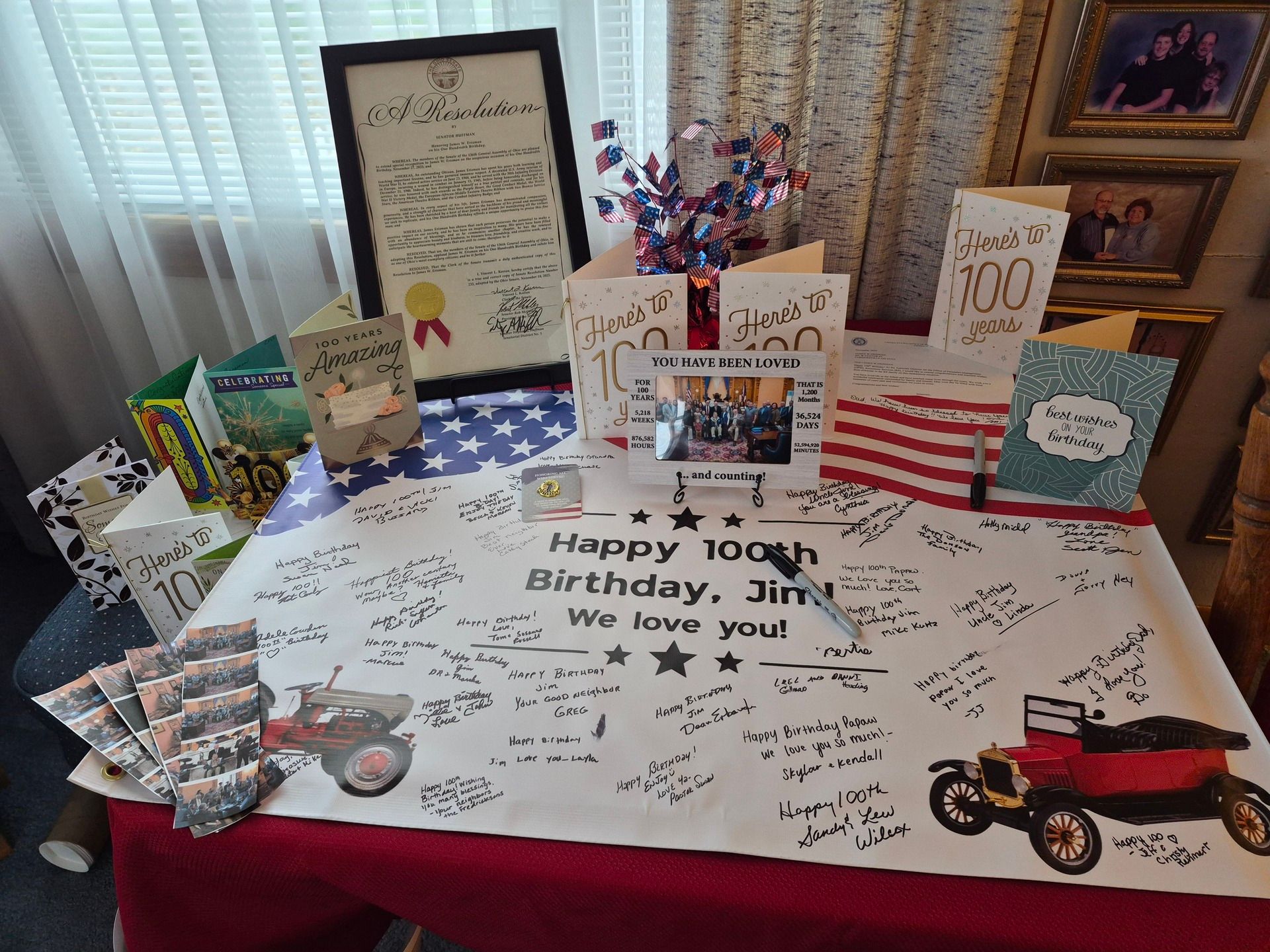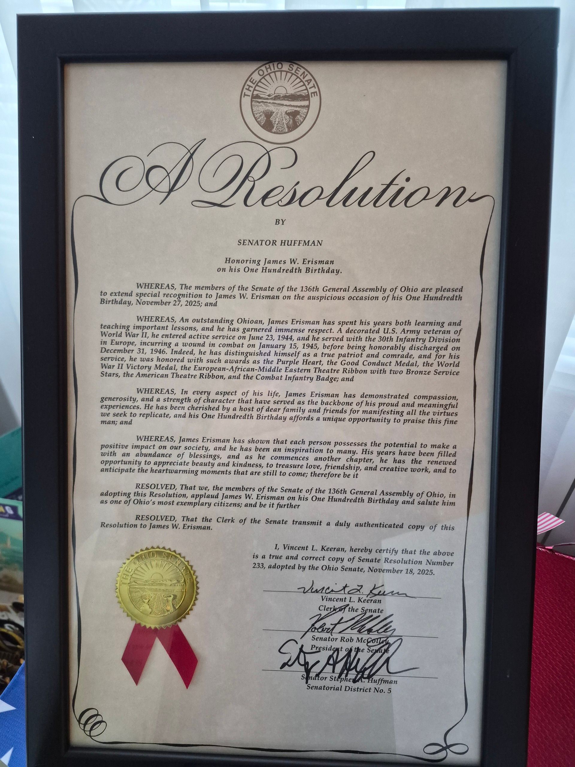 His family and many community members and elected officials disagree. Fresh off a visit to the Ohio State Senate in Columbus to receive a proclamation recognizing his service in WWII and status as a centenarian, Jim learned that the Village of Farmersville had proclaimed November 26, 2025 as “James W. Erisman Day.”