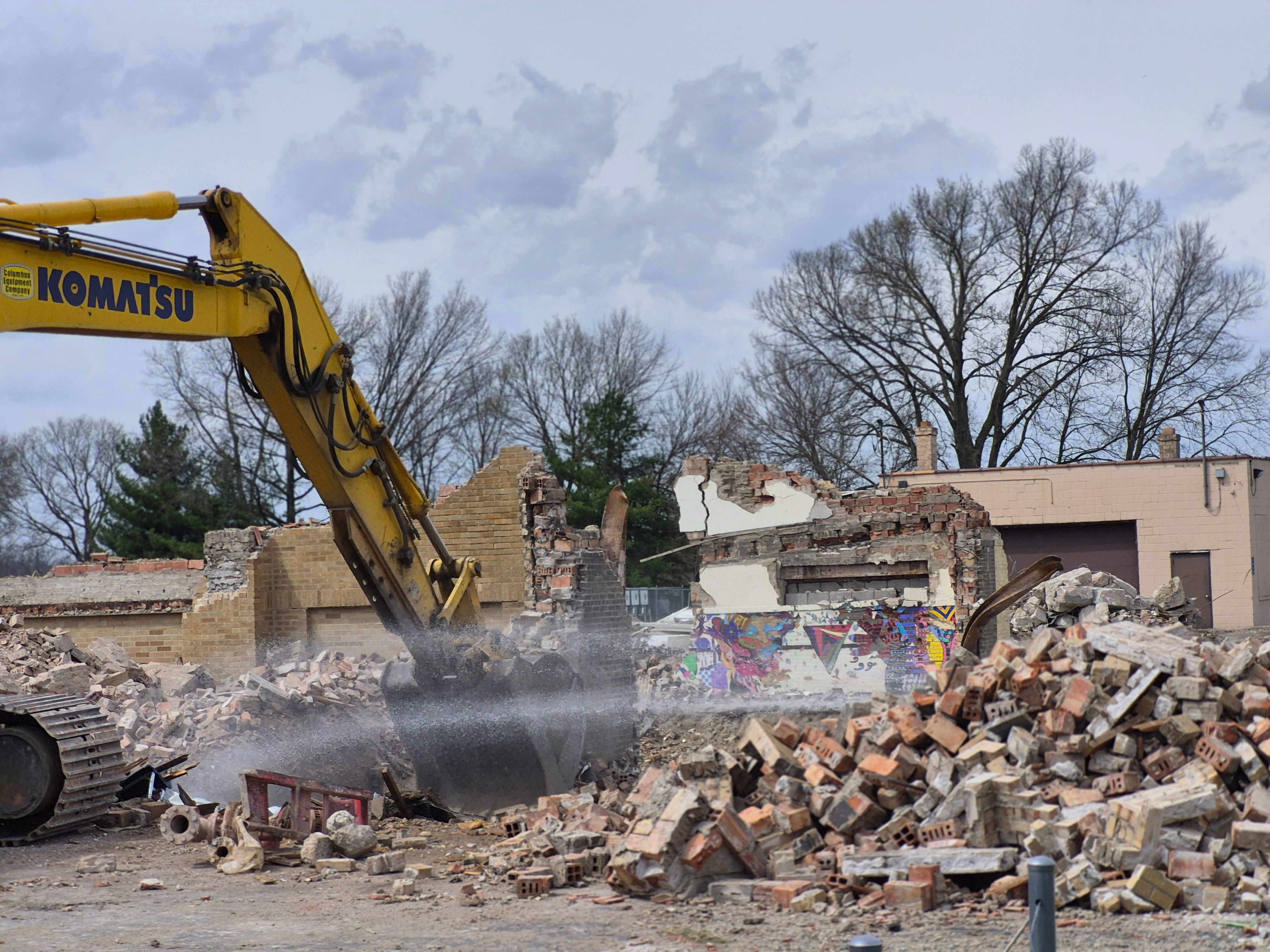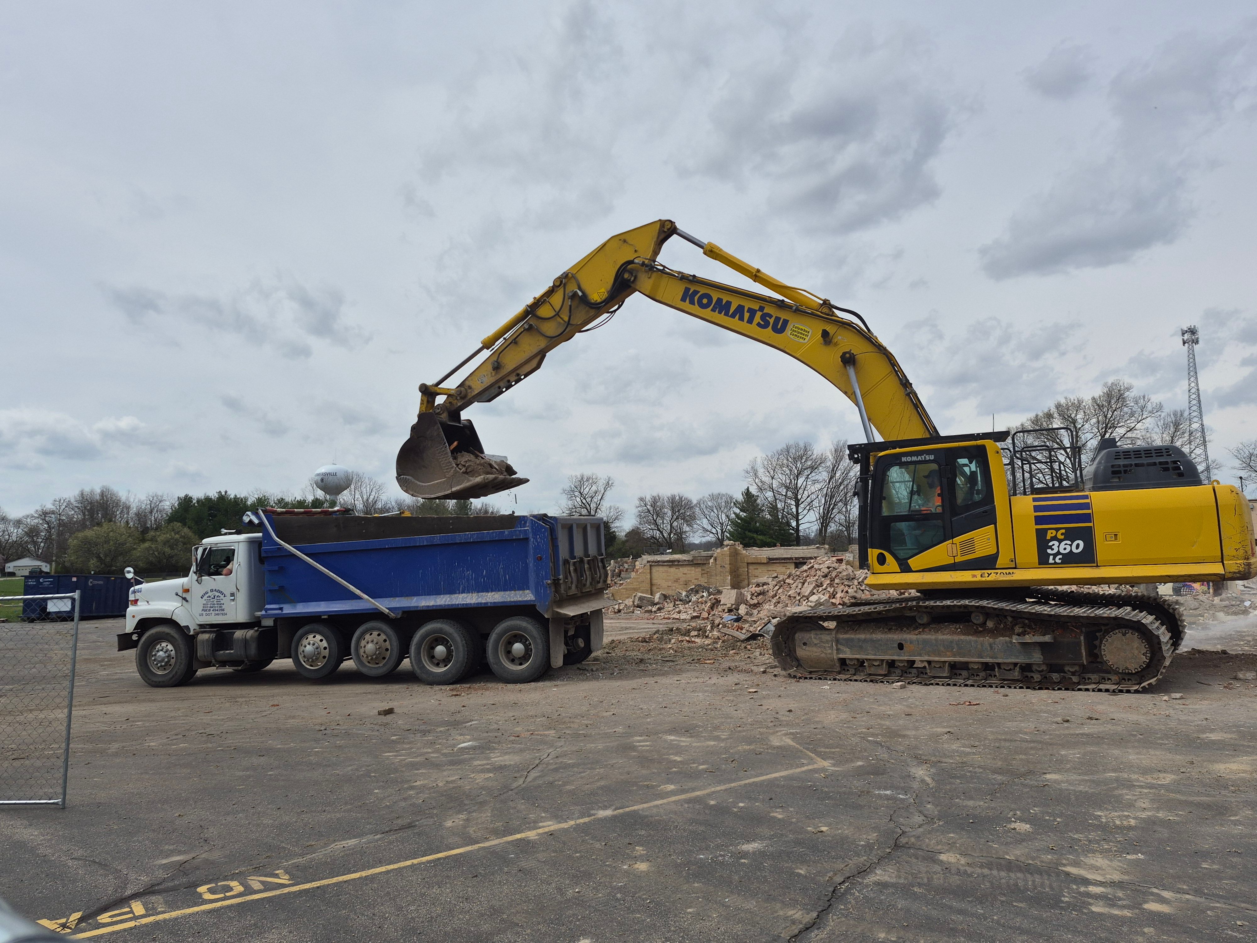 As of Tuesday, the building and gym were demolished. Trucks from Big Daddy & Son Trucking of Dayton and Landis Trucking of Farmersville are hauling away debris from the site.